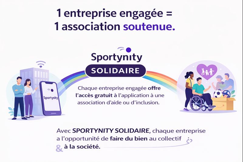 Avec SPORTYNITY Solidaire, chaque entreprise engagée offre l’accès gratuit à l’application à une association d’aide ou d’inclusion. Avec SPORTYNITY SOLIDAIRE, chaque entreprise a l’opportunité de faire du bien au collectif et à la société. Parce que la motivation et le bien-être n’ont de valeur que lorsqu’ils se partagent, SPORTYNITY fait du sport un véritable moteur de solidarité. Contactez-Nous !